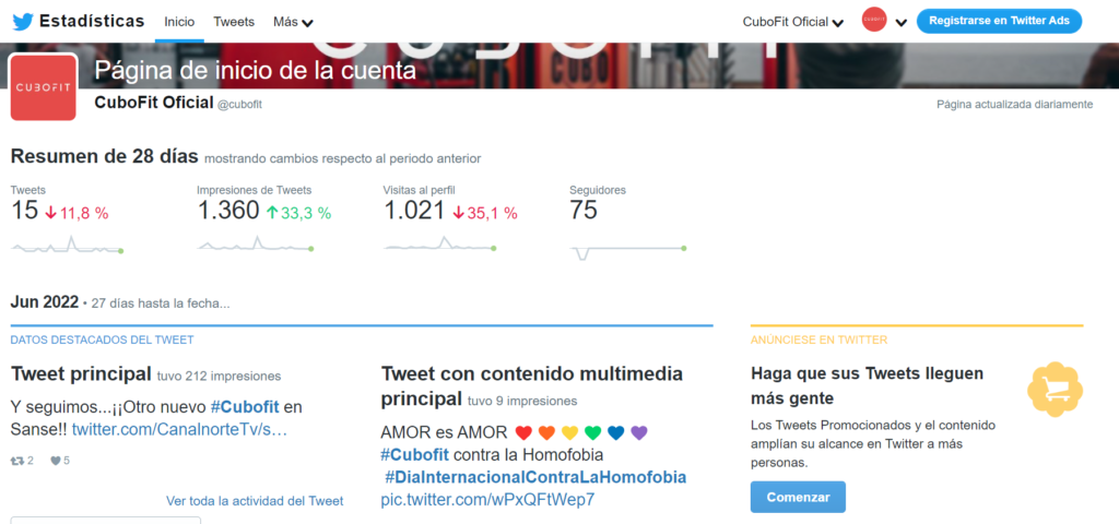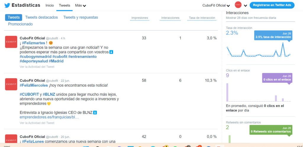 En este caso, la página nos muestra un resumen donde indica el número de tweets publicados en los últimos 28 días, las impresiones de los tweets, así como las visitas al perfil y el número de seguidores, además de los tweets destacados del periodo.