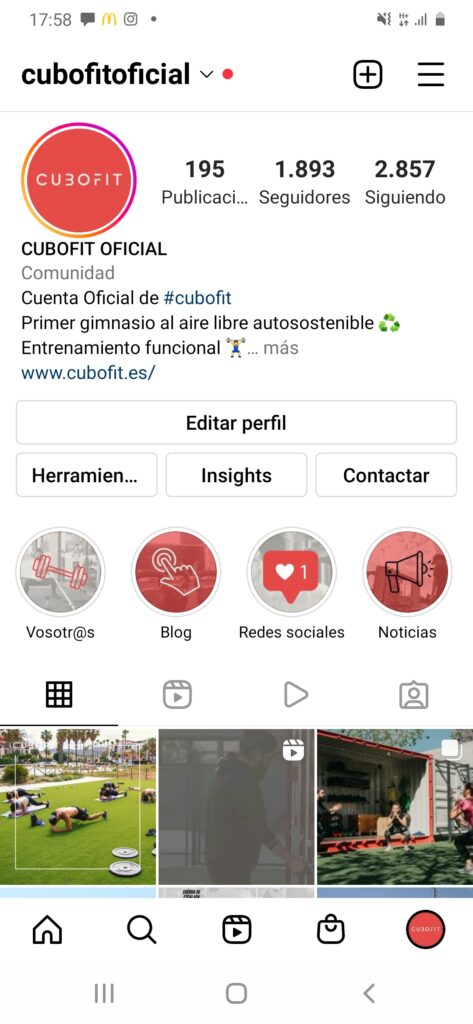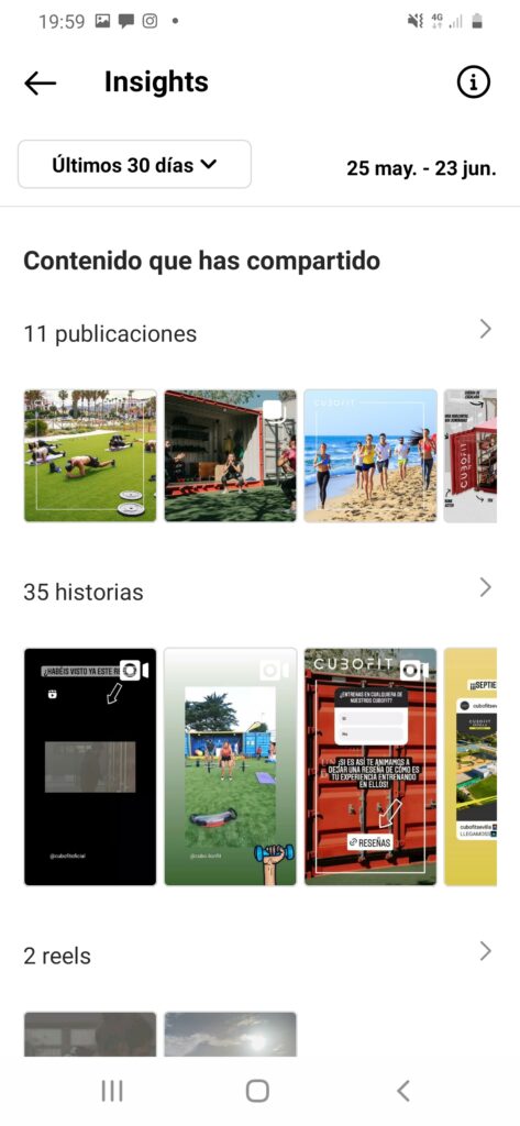 Analizamos aquí por contenido compartido y según los parámetros que queramos medir ordenamos según el tipo de publicación (video, foto, o publicaciones por secuencia) y por alcance, comentarios, impresiones, interacciones, etc. ( en nuestro caso está ordenado por el alcance de la publicación ya que los que nos interesa es conocer que tipo de publicaciones llegan a un mayor numero de cuentas que son y no son seguidores nuestros para así causar impresión en ellos y que nos sigan = aumentar número de seguidores = mayor impacto = mayor conocimiento de CUBOFIT). Esto igual para historias destacadas, reels y vídeos.