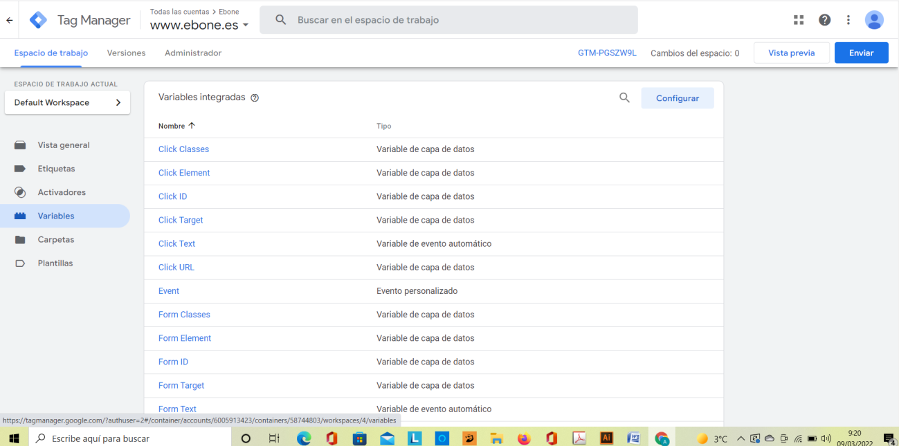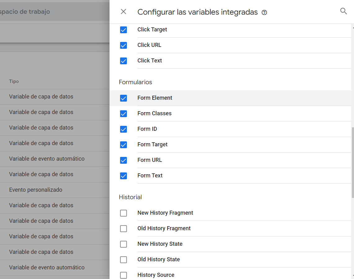 - En primer lugar, en la barra de administración pinchar en Variables. Dentro de esta pestaña, habrá que configurar las variables que vamos a calcular como evento, están predeterminadas, con lo que sólo tendrás que seleccionar aquellas que vas a utilizar, por ejemplo, los formularios: