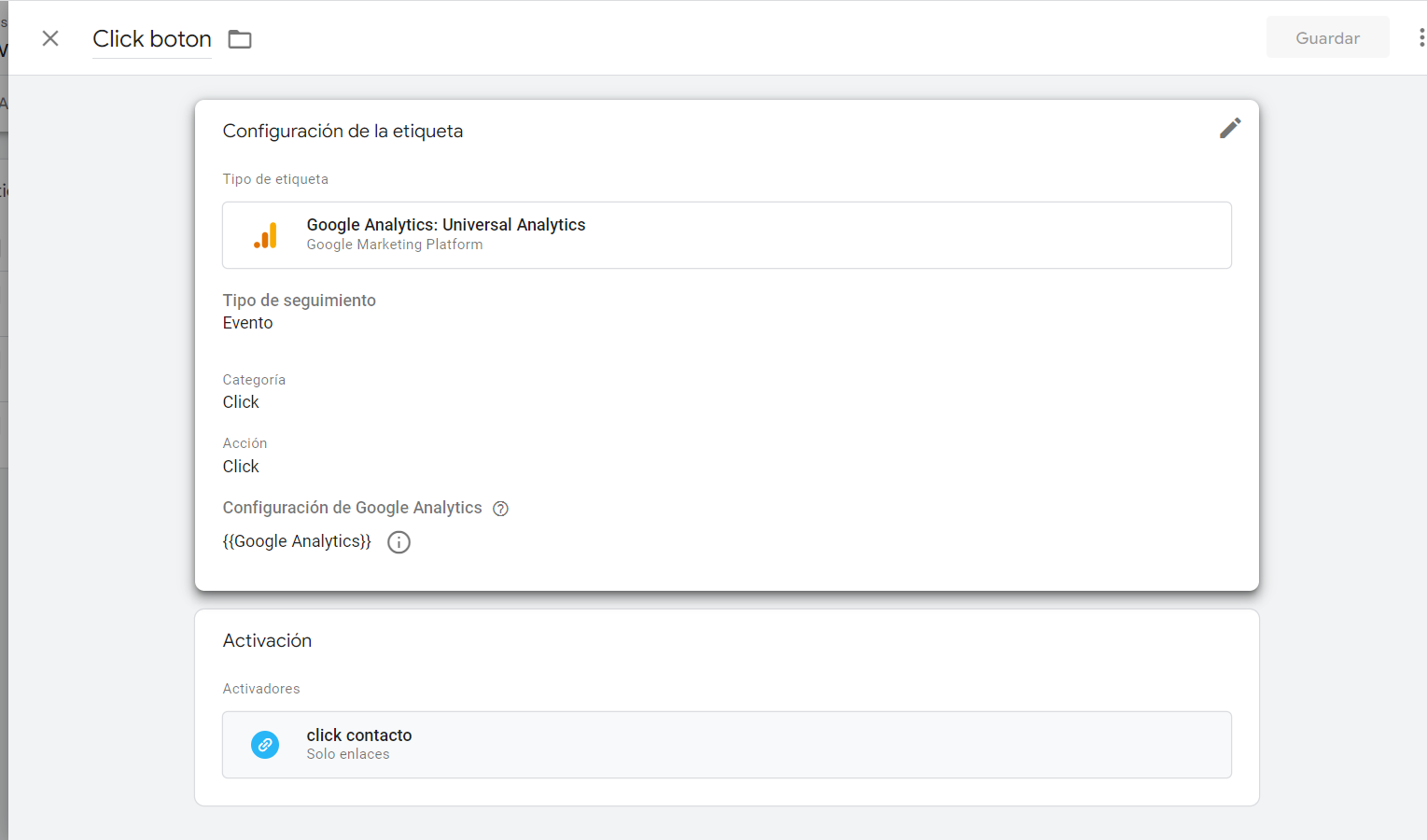 - Una vez pinchar en nueva, nos saldrá una pantalla para su configuración, lo primero que haremos será ponerle un nombre para diferenciarla. Después en el tipo de etiqueta pondremos Google Analytics: Universal Analytics. En tipo de seguimiento ponemos Evento, y en categoría y acción un nombre descriptivo. En configuración de Google Analytics agregamos la variable {{Google Analytics}}. Todo esto se puede ver en la imagen siguiente.