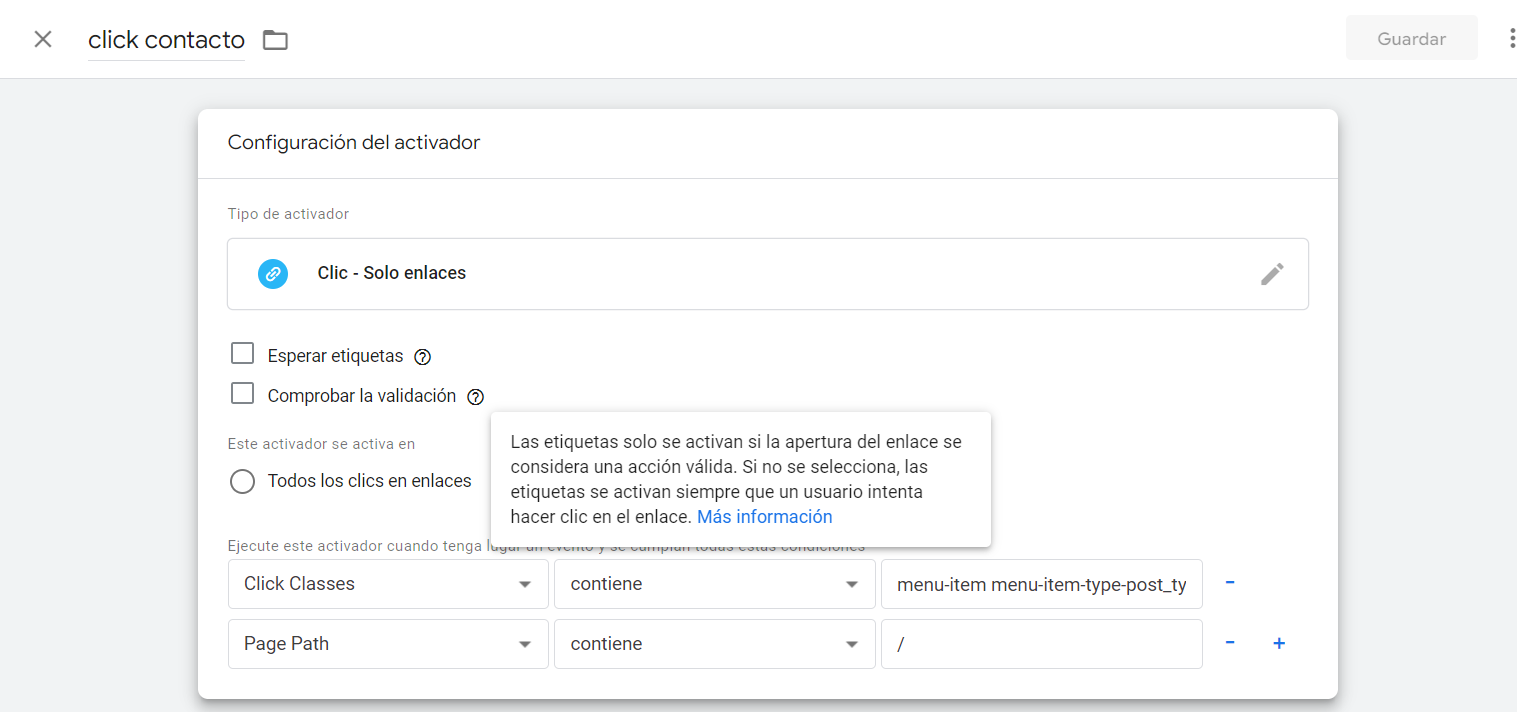 - Tras rellenar la pestaña de configuración, hay que rellenar la pestaña en la parte de debajo de activación. Pinchar y se nos abrirá una página. Poner nombre en primer lugar, en el tipo de activador buscar en los predeterminados los que queremos tener, tras esto, decir si queremos que sean todos los eventos de ese estilo, o solo de algunas páginas/clases/url concretos. La clase en html o el ID se colocan debajo en el caso de querer que sea un elemento en concreto, si no marcar la casilla de todos.