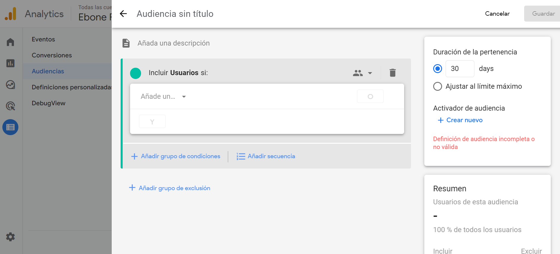 Al crear una audiencia personalizada, filtramos mediante intereses qué tipo de audiencia queremos para este nuevo segmento. Y, ponemos cuanto queremos que dure esta pertenencia.