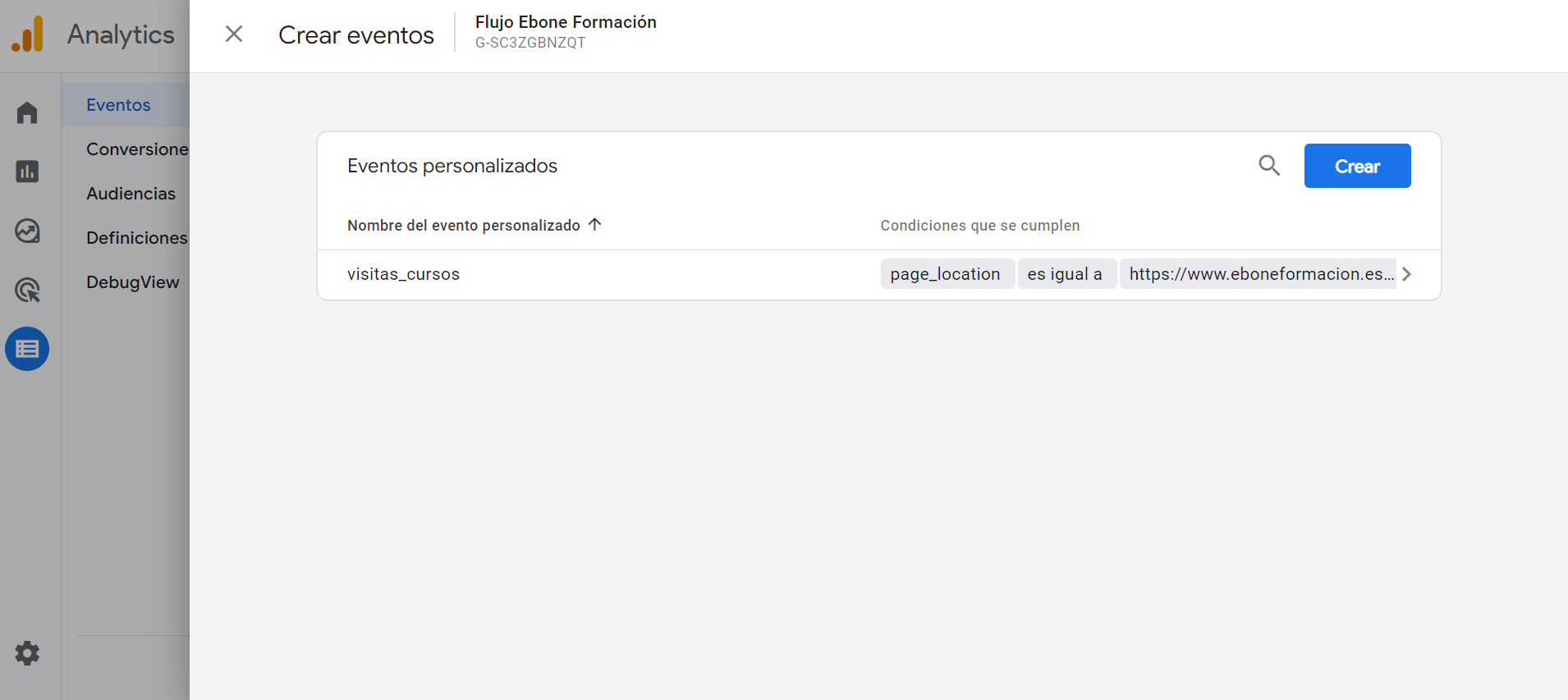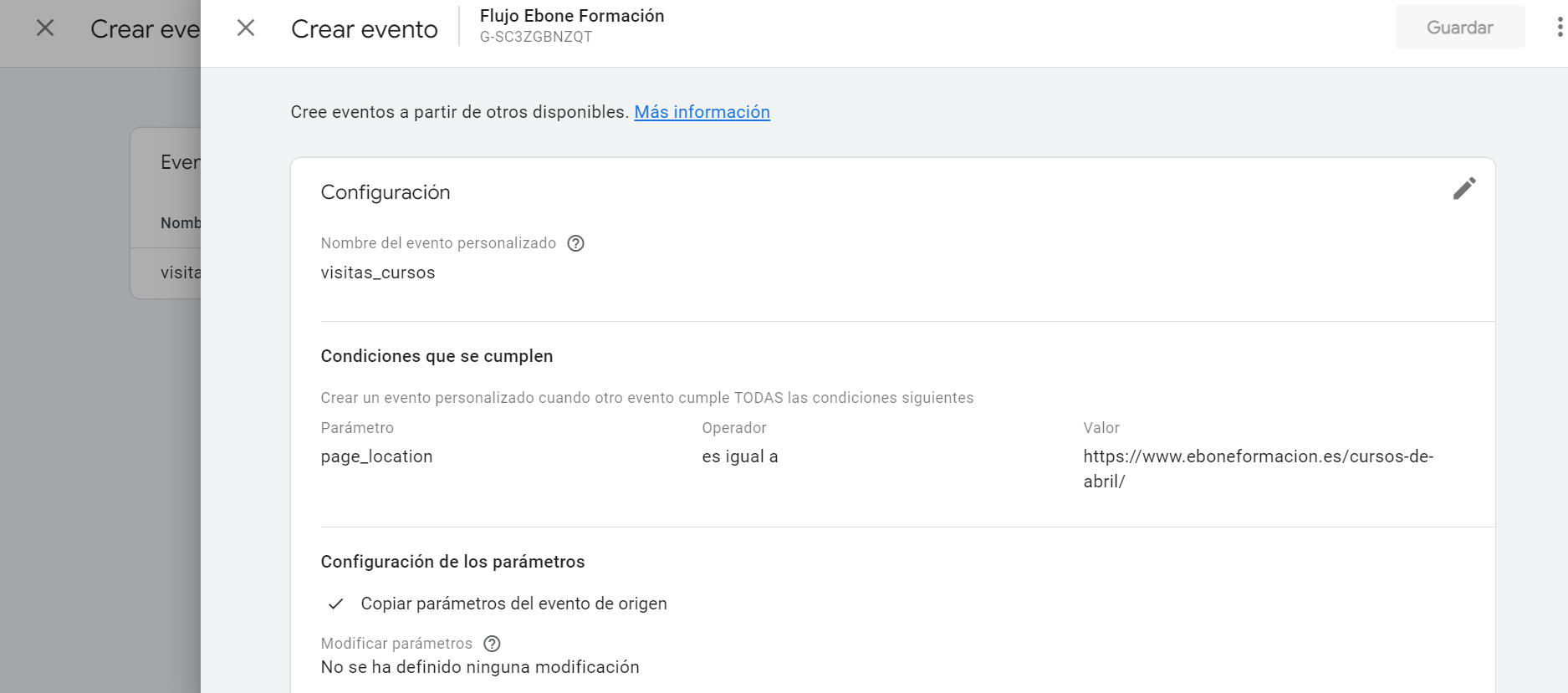 En nombre del evento, elegimos el nombre del objetivo que queremos realizar. Por ejemplo, aquí queremos conocer los usuarios que visitan nuestra página de cursos, por lo que el nombre que hemos elegido es visitas_cursos.