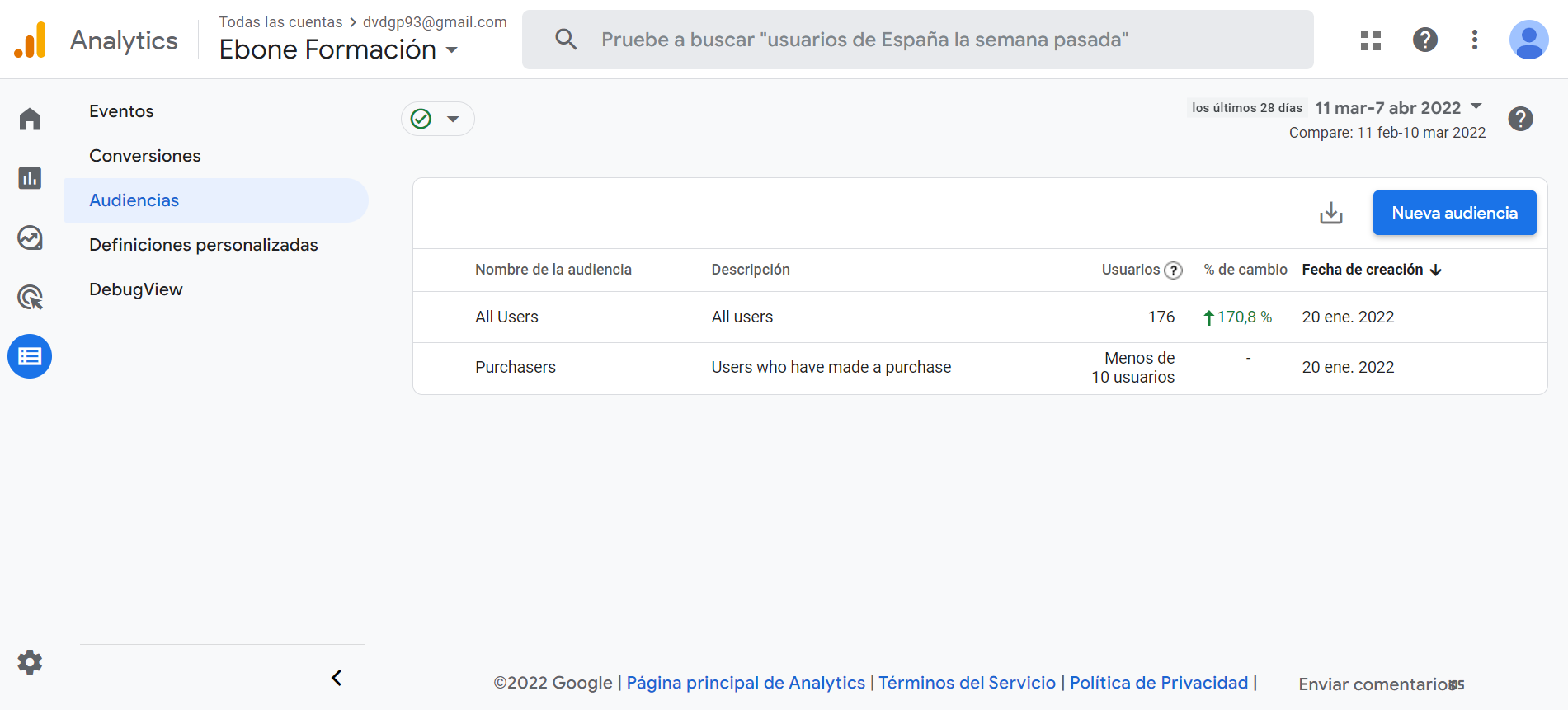 Dentro vienen dos grupos de audiencia creados automáticamente. Uno es All users, y otro es Purchasers que hace referencia a las ventas que se hagan a través de nuestra página web.