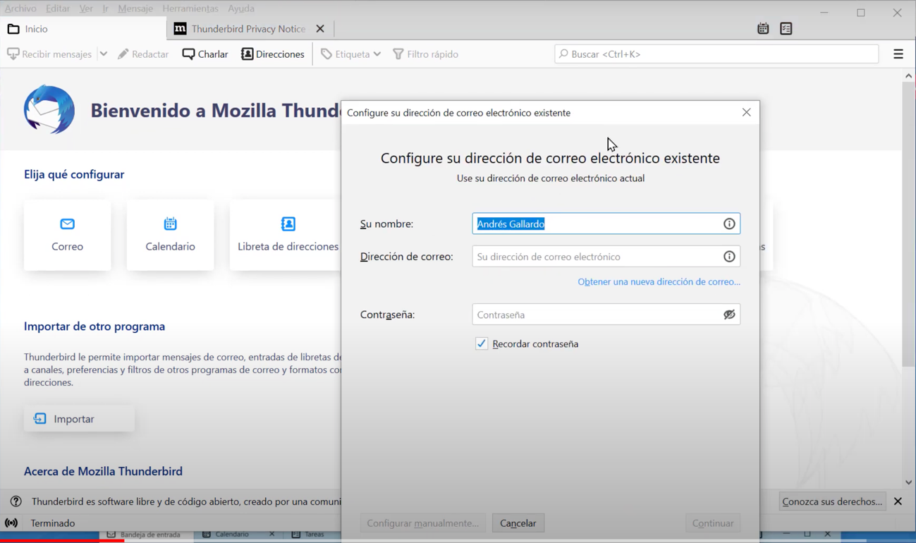 Vamos con el paso 2. Al abrir el programa por primera vez, deberían abrirse dos ventanas, como se ve en la imagen (Si no aparece la segunda, podemos ir a las tres rayitas arriba a la derecha -> Nuevo -> Cuenta de correo existente y se abrirá).