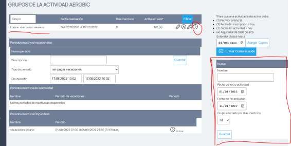 En este ejemplo sólo tenemos creado un grupo creado para aeróbic porque preferimos organizarlo de esta manera, pero si queremos crear otro grupo más dentro de la actividad o editar podemos hacerlo sin problema. Lápiz editar, flecha para entrar. A nuestra derecha panel para crear nuevos grupos dentro de la actividad.